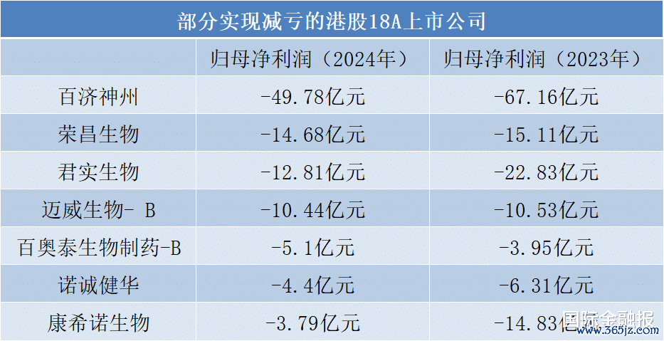 此外,据《国际金融报》记者统计港股18A板块上市公司中,荣昌生物、君实生物、百奥泰、诺诚健华、康希诺生物等均在2024年实现减亏。