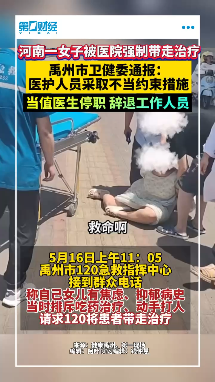 相关视频河南一女子被医院强制带走治疗,禹州市卫健委通报:医护人员采取不当约束措施,当值医生停职,辞退工作人员